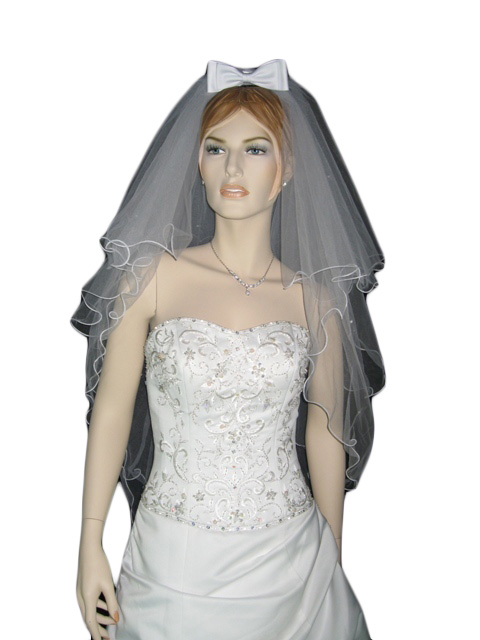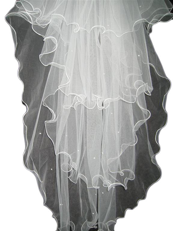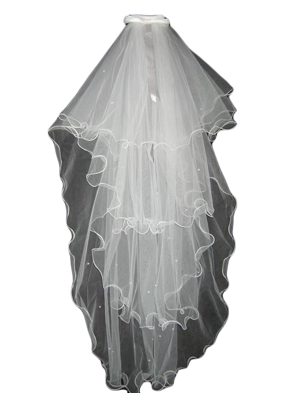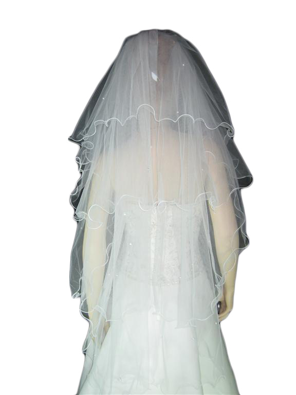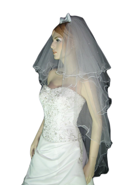 This is a stunning BRAND NEW, NEVER WORN or TRIED ON 4 tiered fingertip length wedding veil. The veil is made of two pieces of tulle folded in half to create the look of 4 layers and center gathered. It is different than the regular 4-layer veils that are made of four pieces of tulles. White bridal pearls scattered evenly throughout the tiers. Beautiful filigree edge outline tiers for a fabulous finish. The back of the comb has a back cover that is attached to a bow tie. Unlike the plain veil combs, this veil comb is made to be seen. This veil comb edge is a perfect accent for your veil and wedding dress.