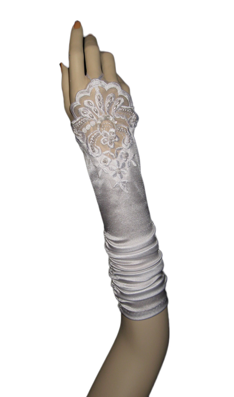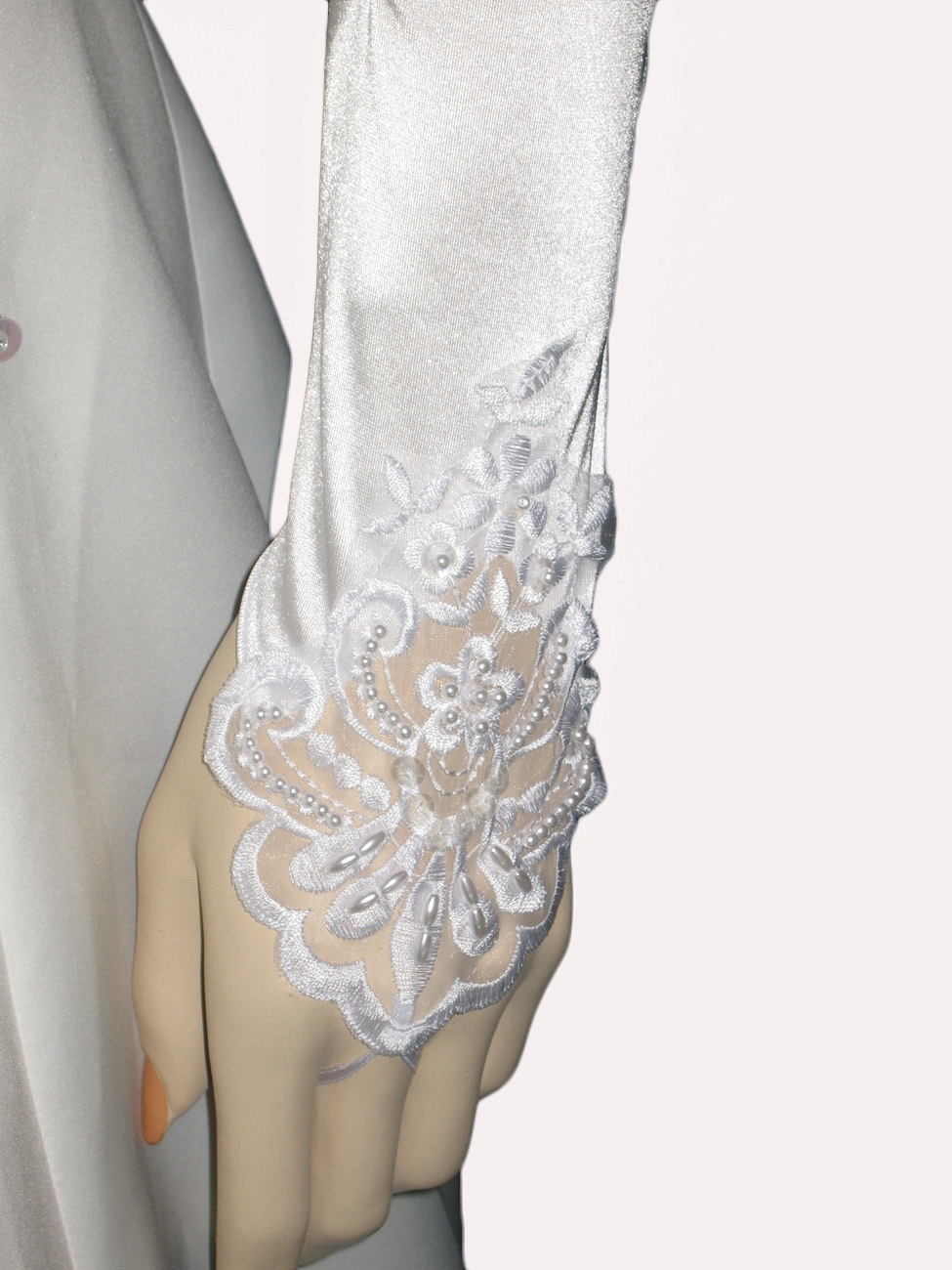 These are beautiful satin lace, beaded fingerless gloves. The beading and lace detailing on these gloves is absolutely gorgeous. You can wear them during the ceremony and your groom can easily slip on your wedding ring. The gloves are gathered on both seams for a romantic look. The gloves measure 19" long from figertip to glove opening. This glove ends just below the elbow. You can also stretch the gathers on the gloves tighter and the gloves can come up just over the elbow. When laying flat, the gloves measure 12" long. These gloves have a smooth and silky finish which gives it an elegant look and is a lovely complement to any bridal dress fabric.
